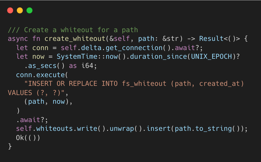 When an agent deletes a file from the base layer, AgentFS inserts a row into fs_whiteout rather than modifying the base. A small SQL row replaces a destructive operation.