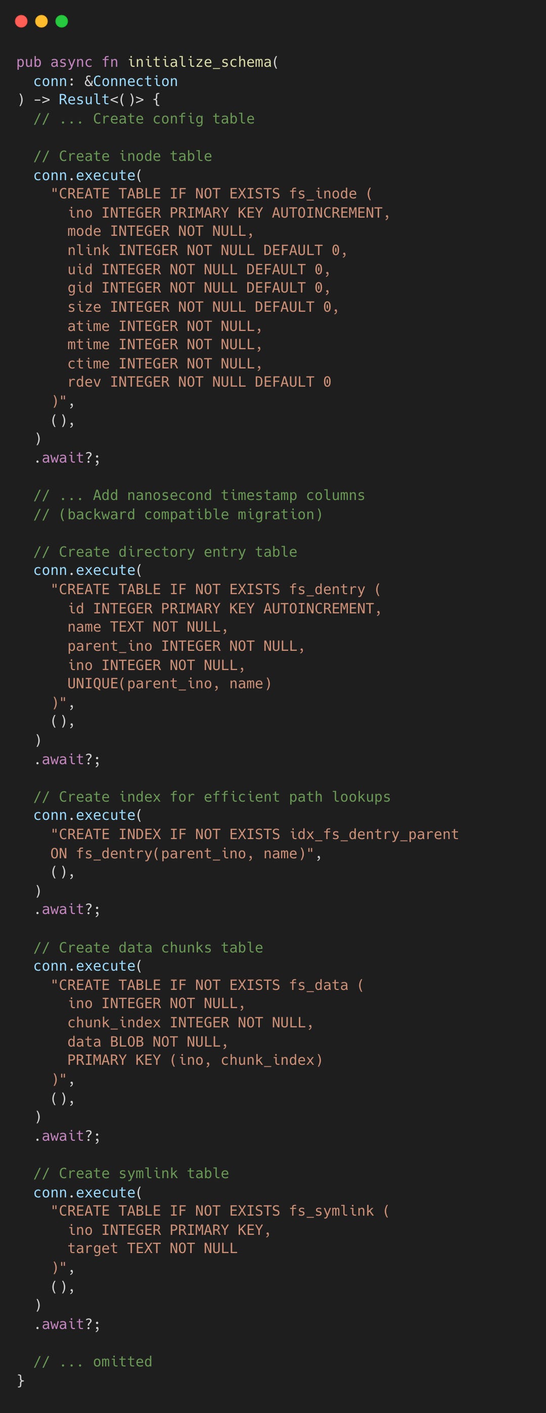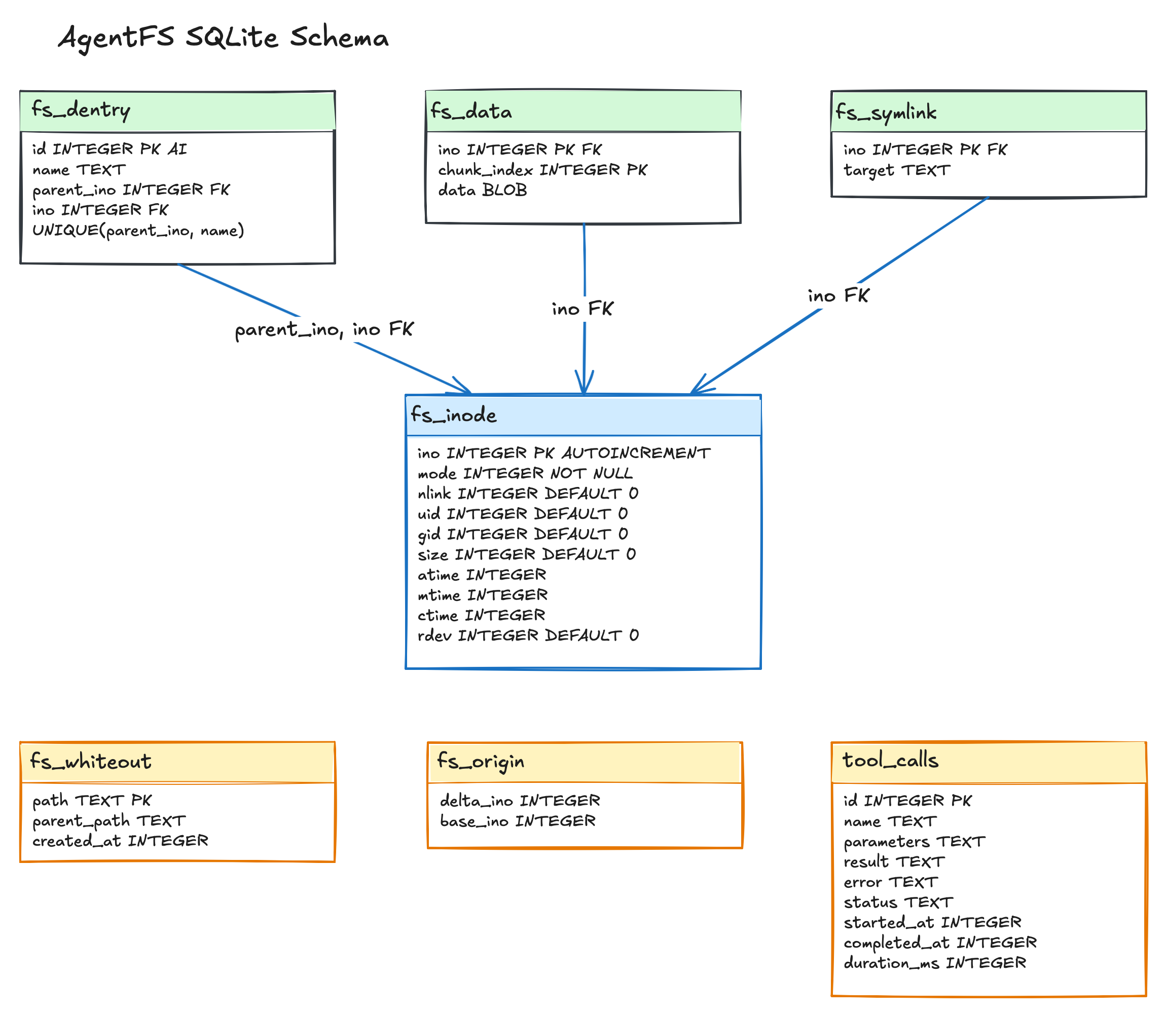 All delta state lives in SQLite tables defined by the AgentFS specification. The schema is a Unix-like inode filesystem, created during initialization.