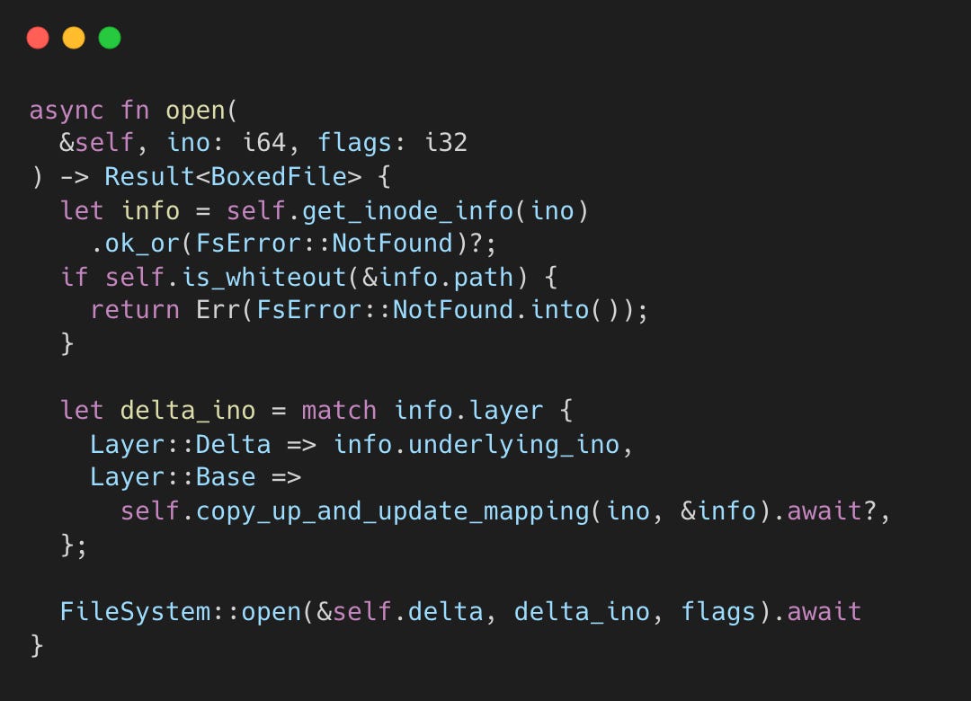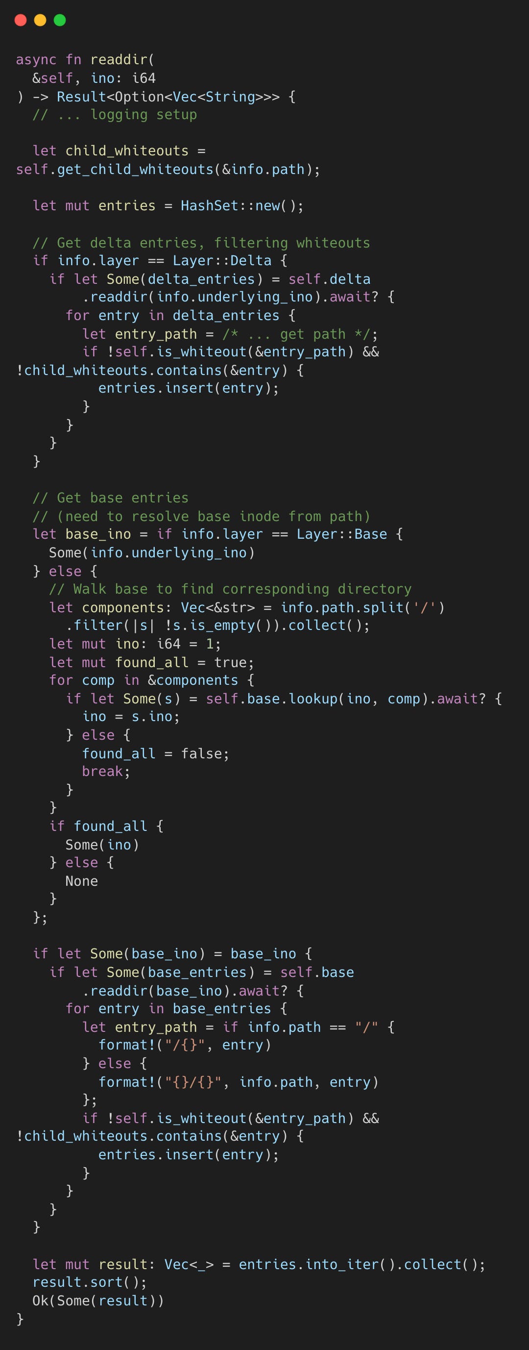 The readdir_plus variant takes this further. Instead of listing names and then issuing a separate getattr call per entry to fetch metadata (size, permissions, timestamps), it fetches names and full stats in a single pass. It loads all base-layer entries into a HashMap, then applies delta-layer entries on top. Any delta entry with the same key overwrites the base entry. A single directory listing grabs all metadata in bulk instead of making a separate call per file.