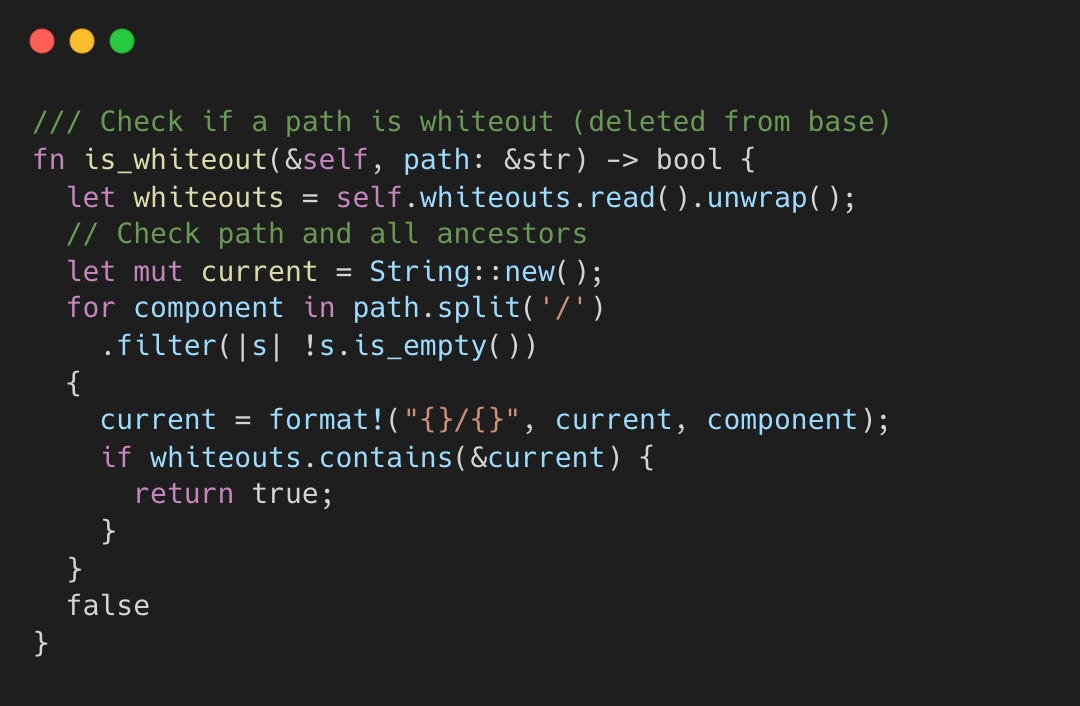 If the file isn’t in delta, the overlay checks the whiteout set. If the path or any ancestor has a whiteout entry, the file is treated as deleted and the base layer is skipped entirely.