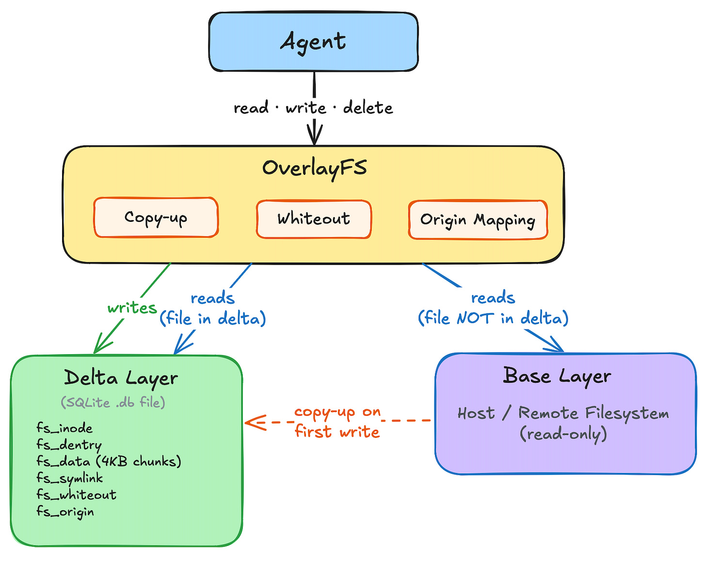When an agent modifies a base-layer file, AgentFS reads it in full, writes it into the delta’s SQLite tables, then applies the modification. Subsequent operations hit the delta copy. This is the architecture’s most visible cost: modifying a large base file triggers a full copy before the write proceeds. For agent workloads that read far more than they write, it’s the right tradeoff.