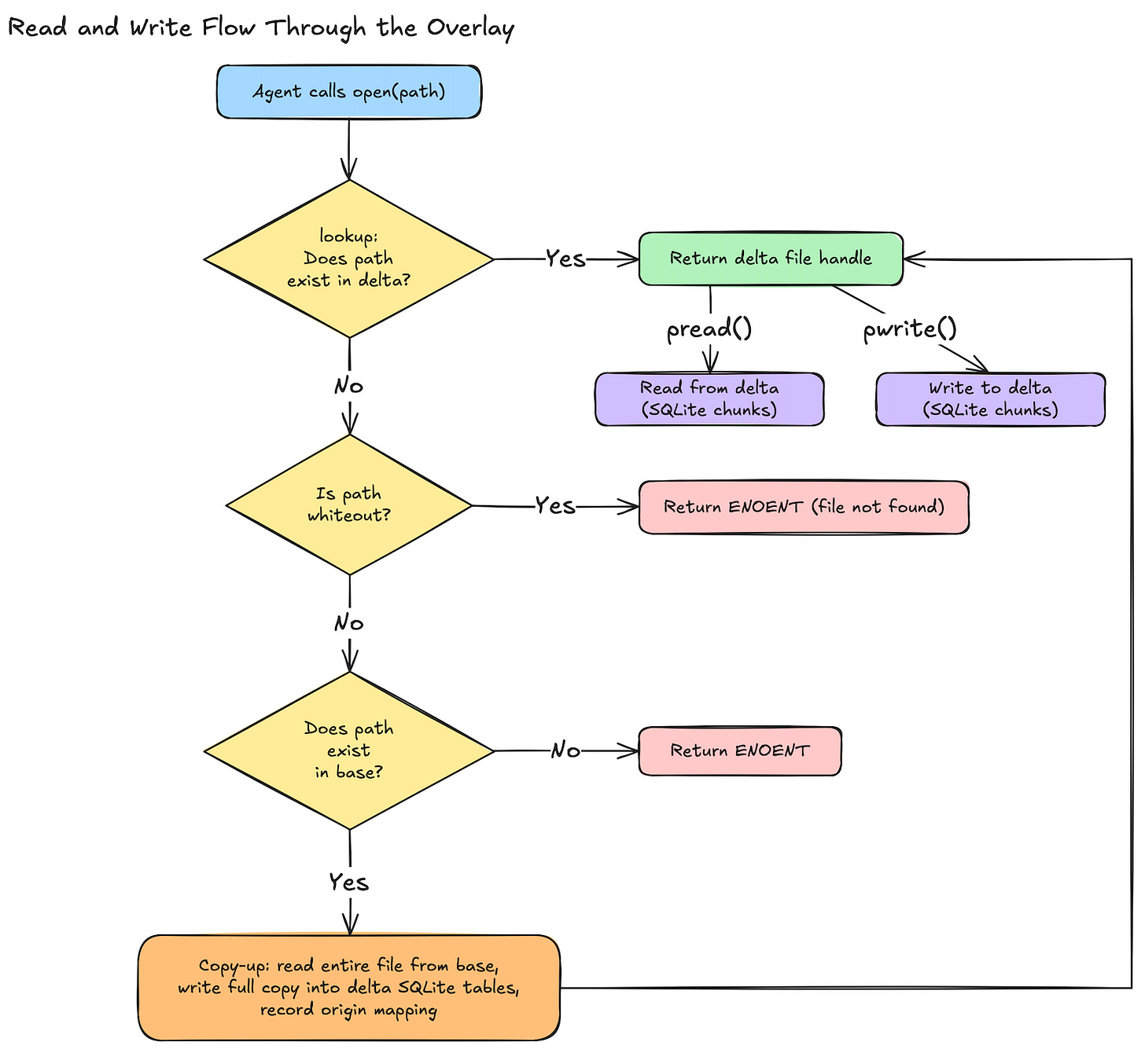 Every file operation starts with a path lookup. The overlay checks the delta layer first. If the file exists in delta (created fresh by the agent or copied up by a previous operation), the delta version wins. The base layer is never consulted.