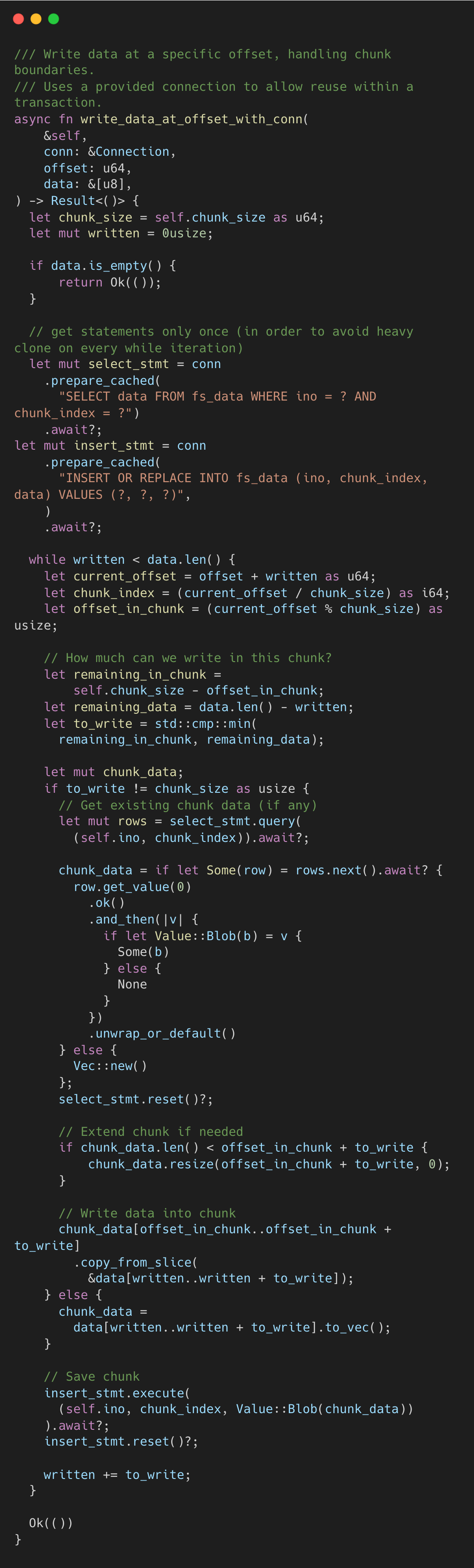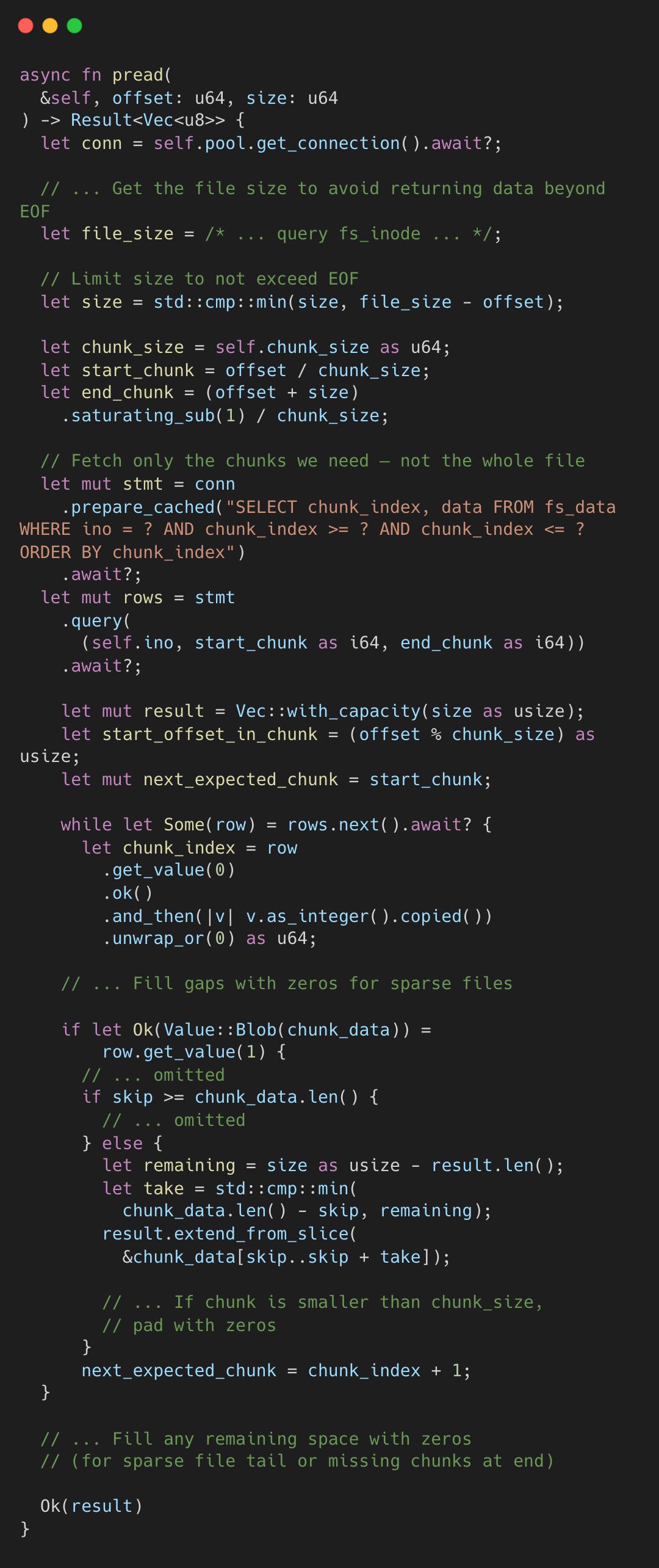 The chunk-based storage in fs_data is worth calling out. Each chunk is keyed by (ino, chunk_index) with a fixed 4096-byte size (except the last chunk). To read bytes at offset N, you compute chunk_index = N / 4096 and offset_in_chunk = N % 4096. This avoids loading a 500MB file into memory just to read the last 4KB.