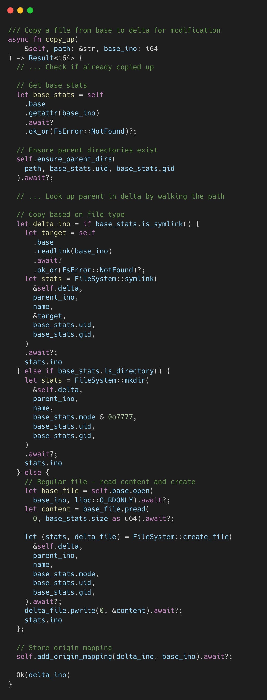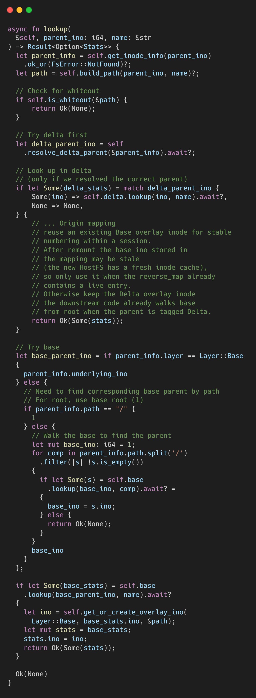 Copy-up handles lazy duplication when an agent opens a base-layer file. Whiteout records track deletions without touching the base. Origin mapping keeps inode numbers stable after copy-up so the kernel’s dentry cache stays consistent. The next section shows how these fit together, then we dig into each one.