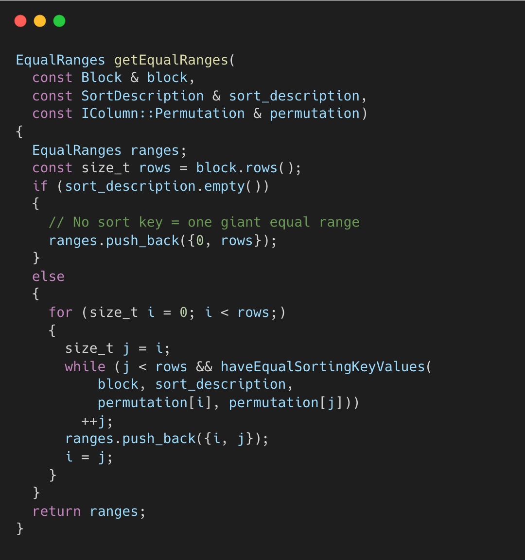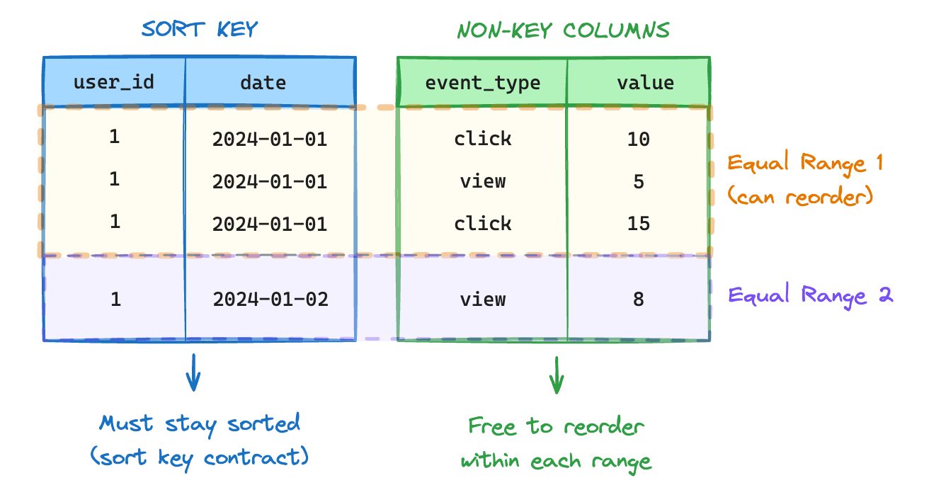 On insert, ClickHouse sorts rows by sort key and creates equal ranges, groups with identical sort key values. Within these ranges, rows can be reordered without breaking the sort key contract. The Row Order Optimizer exploits this freedom.