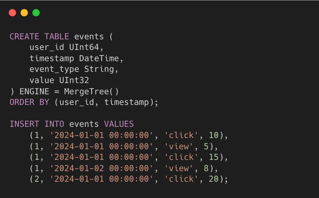 Consider a table with sort key (user_id, date) and columns (event_type, value). If you insert