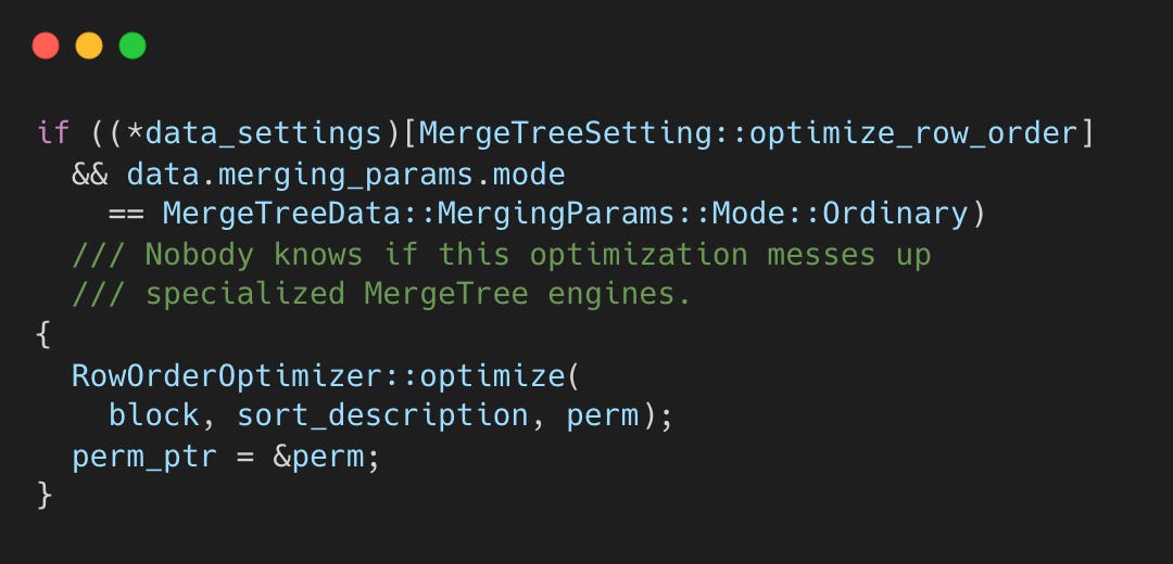 The row order optimizer exploits a gap in this design: within rows that have identical sort key values, the order is arbitrary. That’s where free compression gains hide.
