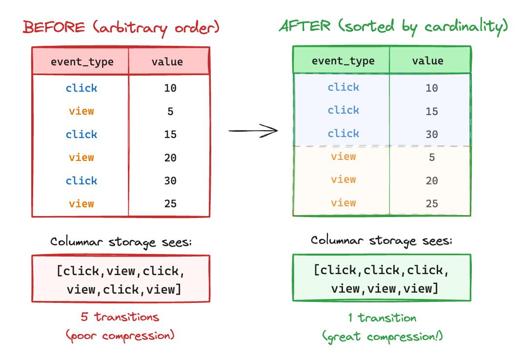 The algorithm sorts rows by non-key columns in ascending cardinality order. If event_type has 2 unique values and value has 100, sorting by event_type groups identical values together. Longer runs of identical values yield better compression.