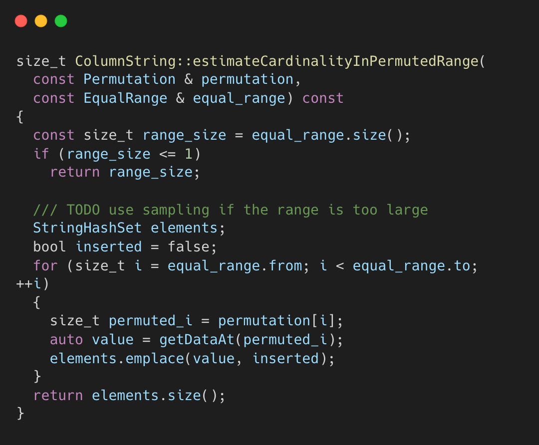 Each column type implements estimateCardinalityInPermutedRange(). For strings, it inserts values into a hash set. Duplicates are ignored, so the set size is the cardinality.