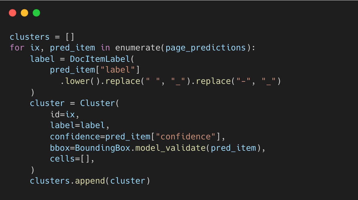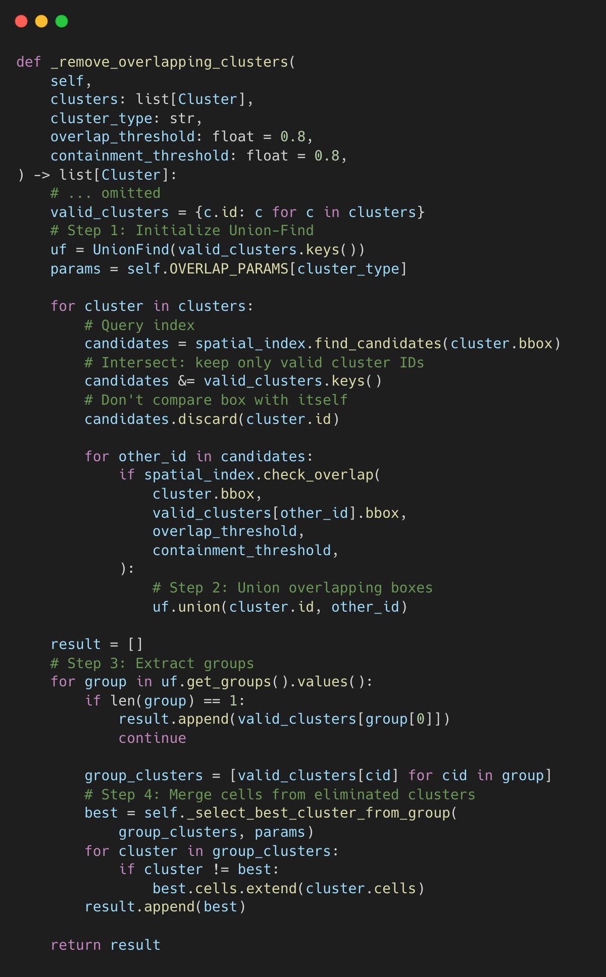 get_groups()returns sets of connected clusters (e.g.,{A, B, C}).Select Best: From each group, keep one cluster (highest confidence) and absorb the text cells from the others.