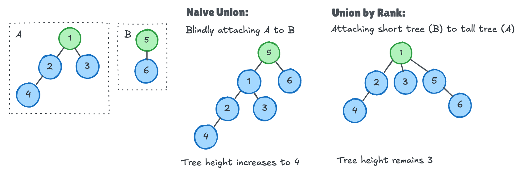 2. Union by Rank: Attaches shorter trees under taller ones to minimize depth.