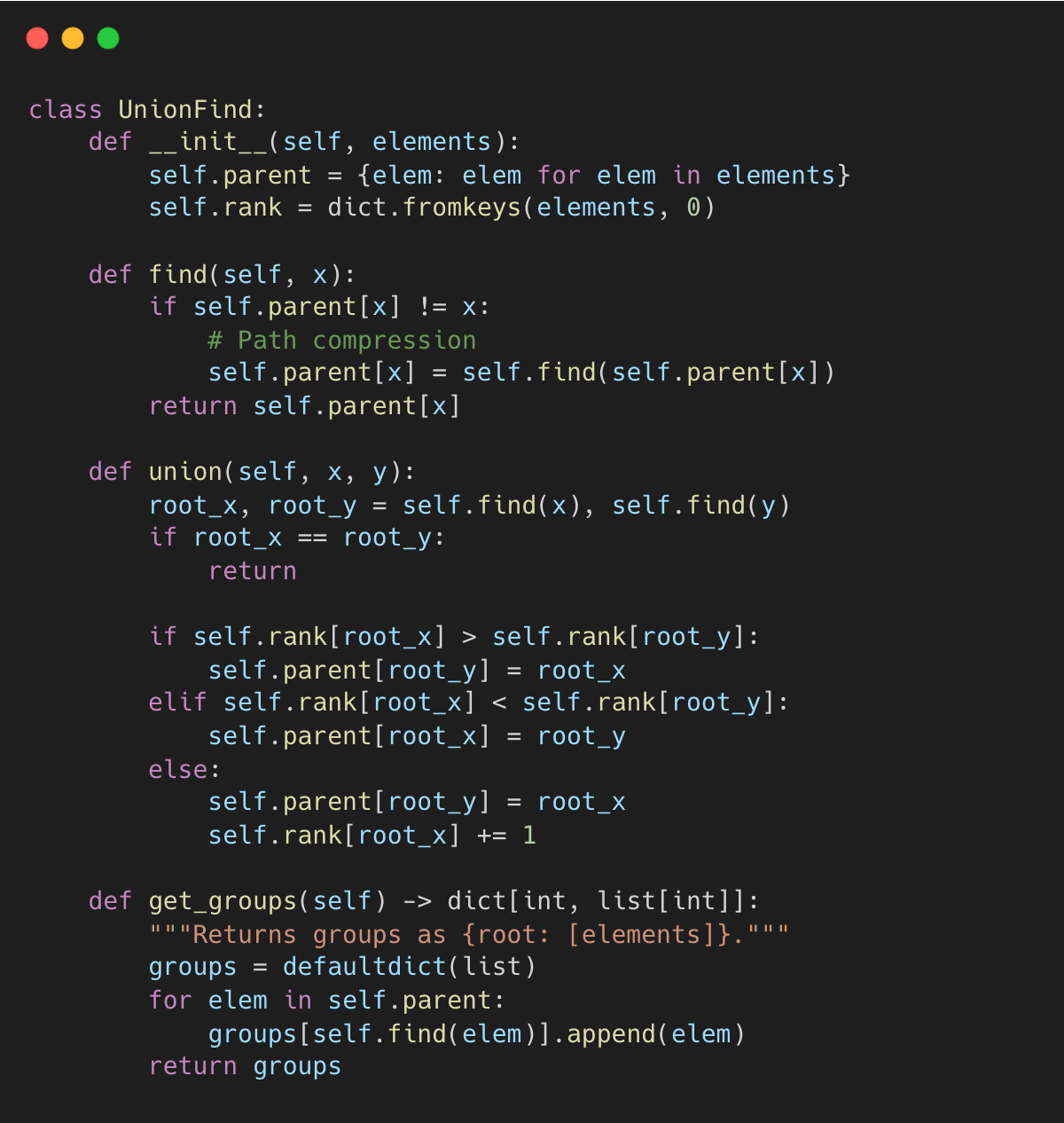 A naive approach is O(n²). Union-Find solves this elegantly by tracking connected components.