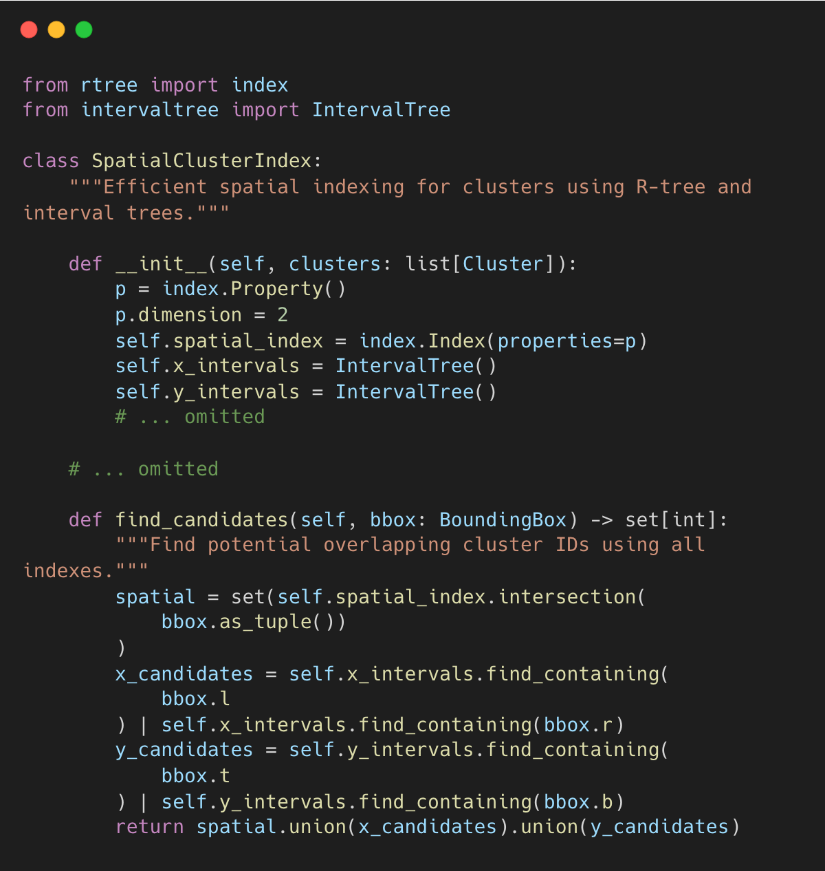 Build Spatial Index: Insert all clusters (bounding boxes from the ML model) into R-tree and Interval trees.