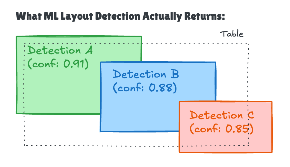 ML layout models (like YOLO, DETR, LayoutLM) don’t “understand” documents; they predict probabilities. A model might predict: “91% chance of a table here.”