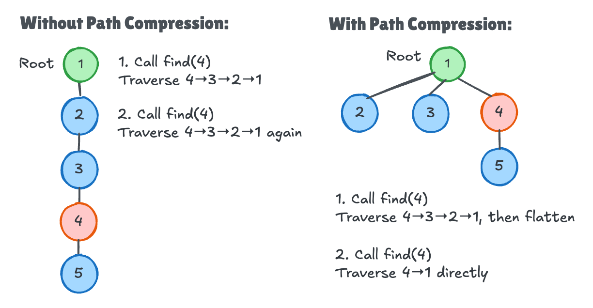 After one find call, all nodes on the path point directly to the root. Future lookups for these nodes are O(1).