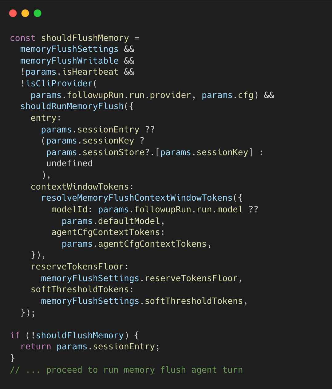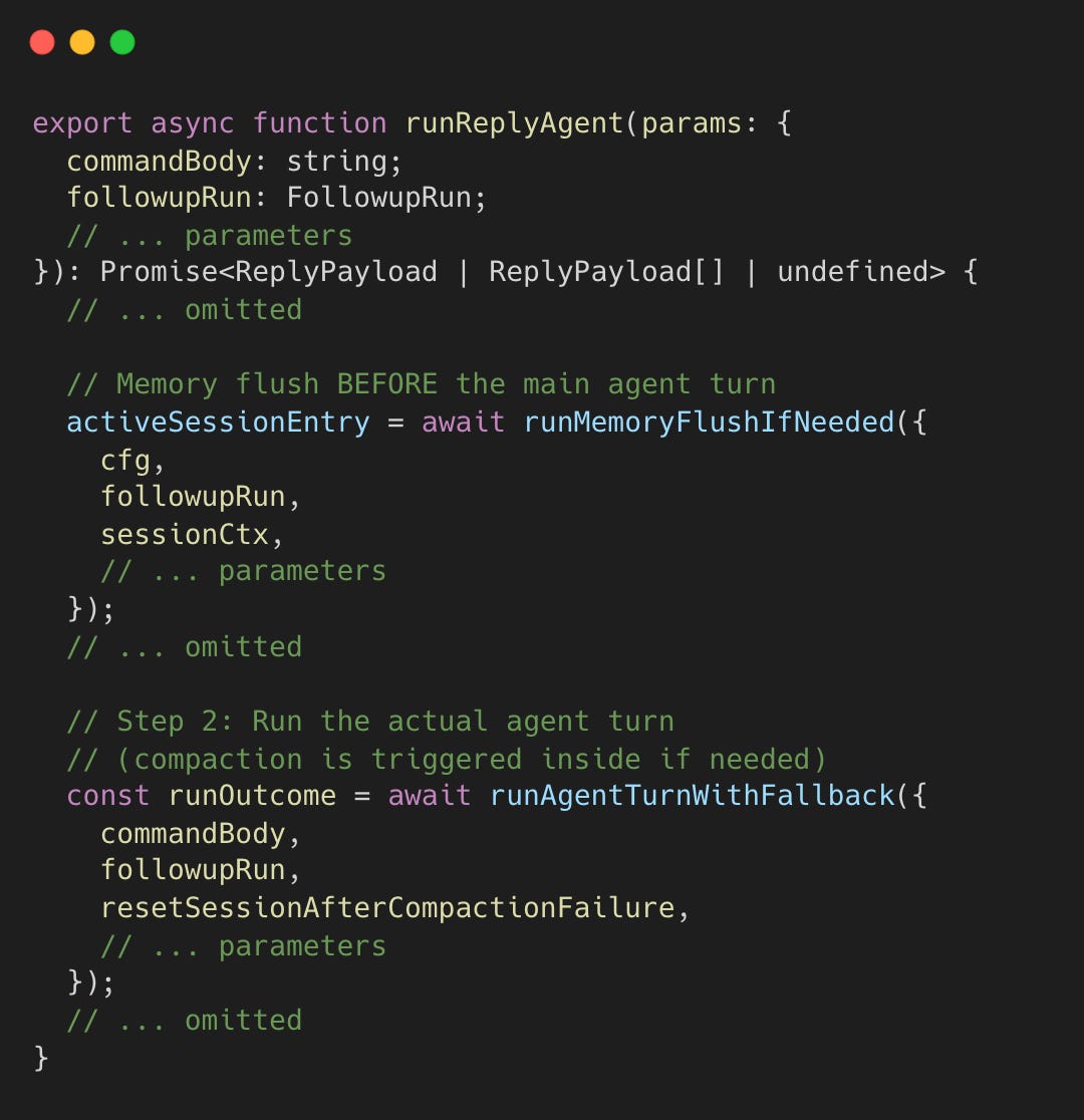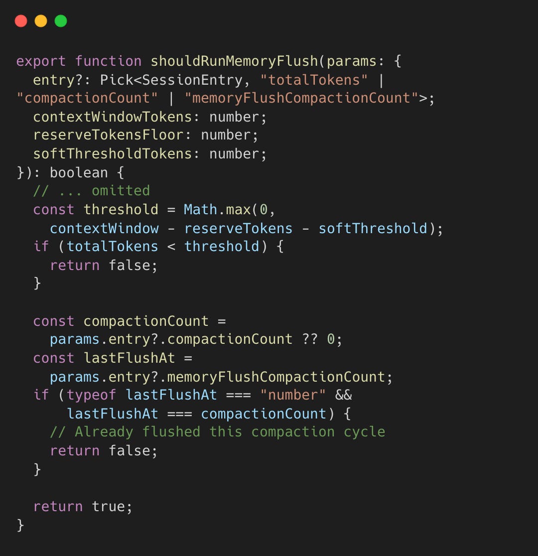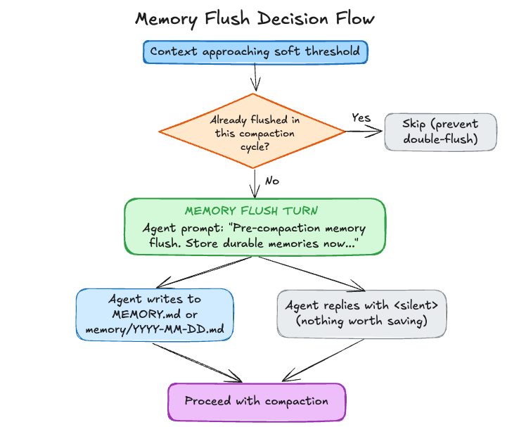 If shouldFlushMemory is true, OpenClaw runs that extra turn; otherwise it proceeds with the main turn. The decision flow is: