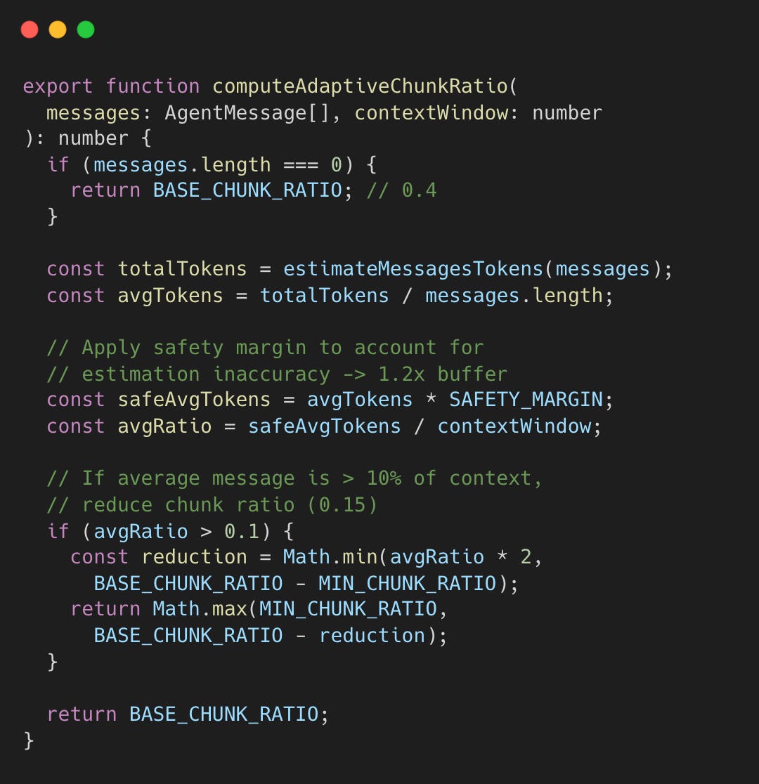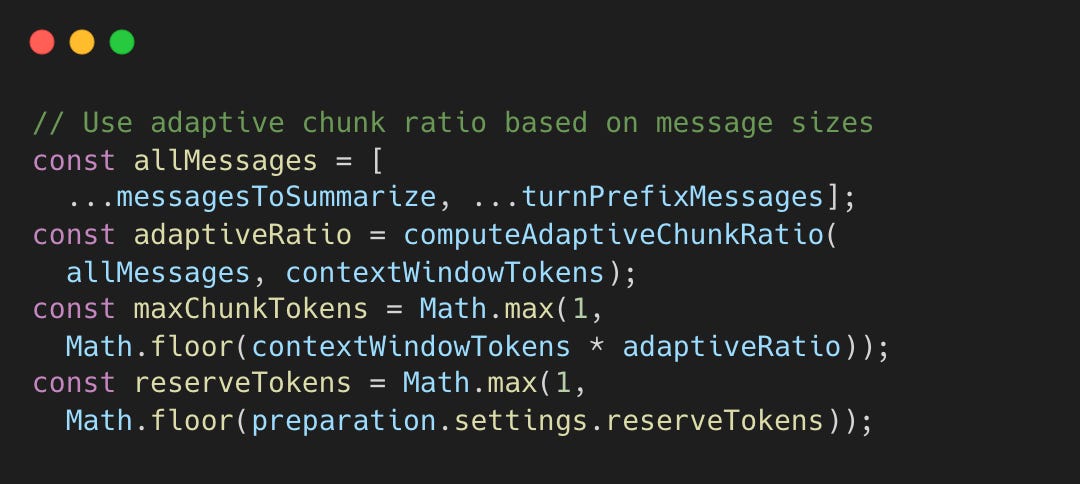 During compaction, the safeguard extension must decide how large each summarization chunk can be. If chunks are too large, the summarization call overflows the context window. If too small, API calls are wasted. The adaptive ratio analyzes the actual message sizes before chunking.