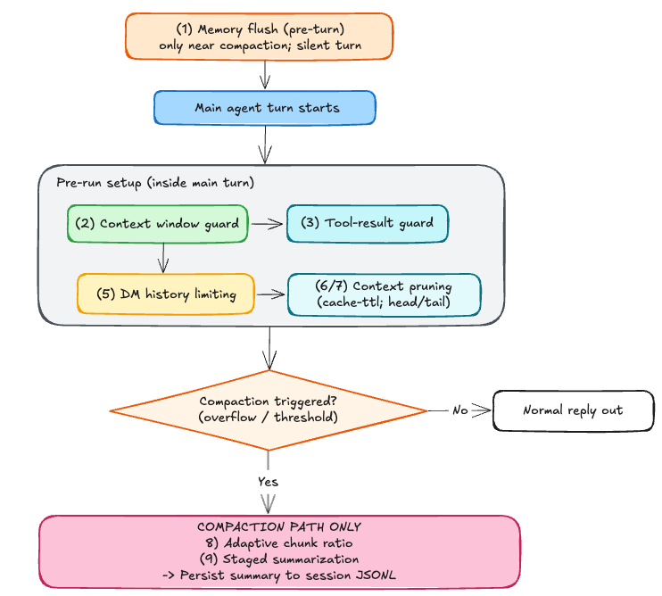 During the main turn, OpenClaw applies its guards and triggers compaction when needed.