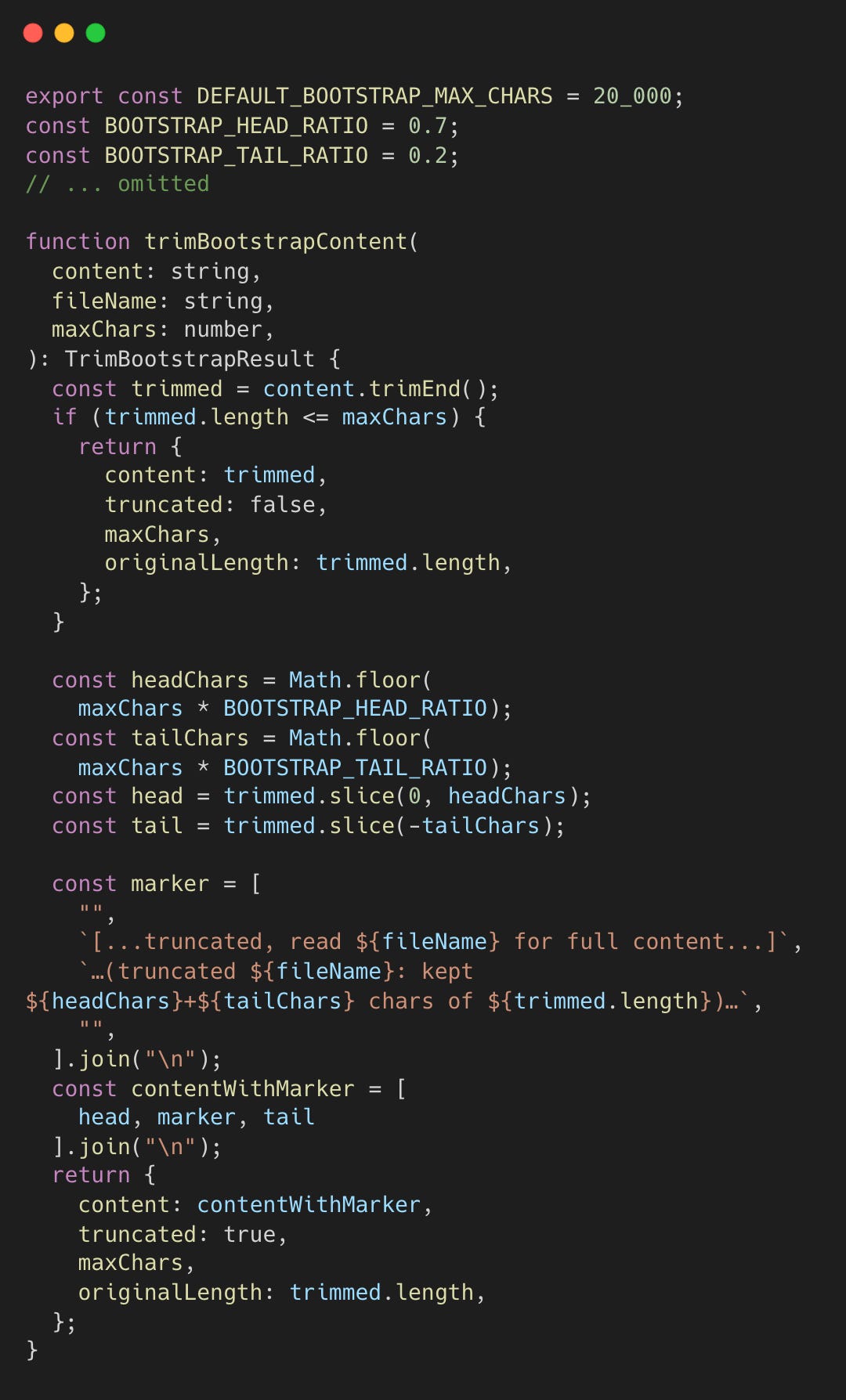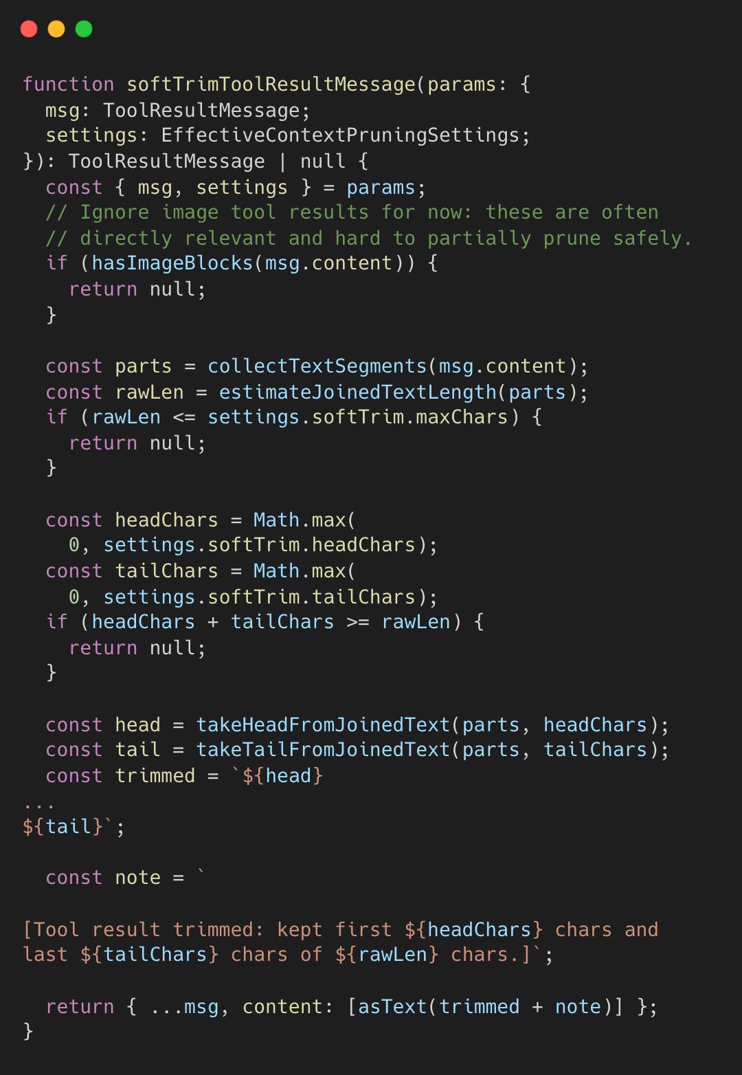 During context pruning, tool results are soft-trimmed if they exceed a fixed character threshold of 4,000 characters. It defaults to keeping the first 1,500 characters (head) and last 1,500 characters (tail).