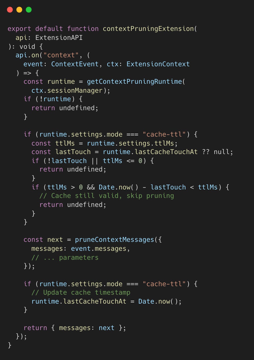 This pruning extension is initialized during session setup. When the session builds its extension paths, it registers the context pruner alongside other extensions. The extension hooks into the agent framework’s “context” event, which fires before each LLM API call—giving it a chance to prune messages before they’re sent.