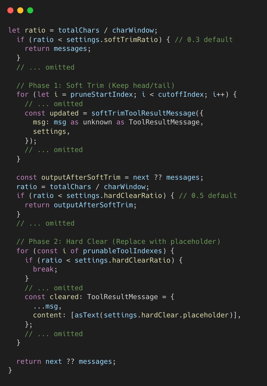 The pruner uses a two-phase approach: soft trim (preserving head/tail) and hard clear (replacing with a marker).