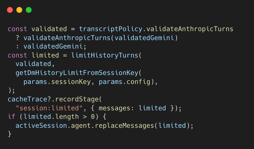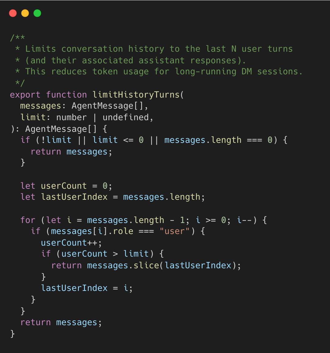 The algorithm walks backward counting user turns, slicing from the last user message boundary when the limit is reached. This preserves complete exchanges rather than cutting mid-conversation. DM session allow configuring the limit per user to keep longer history for high priority users.