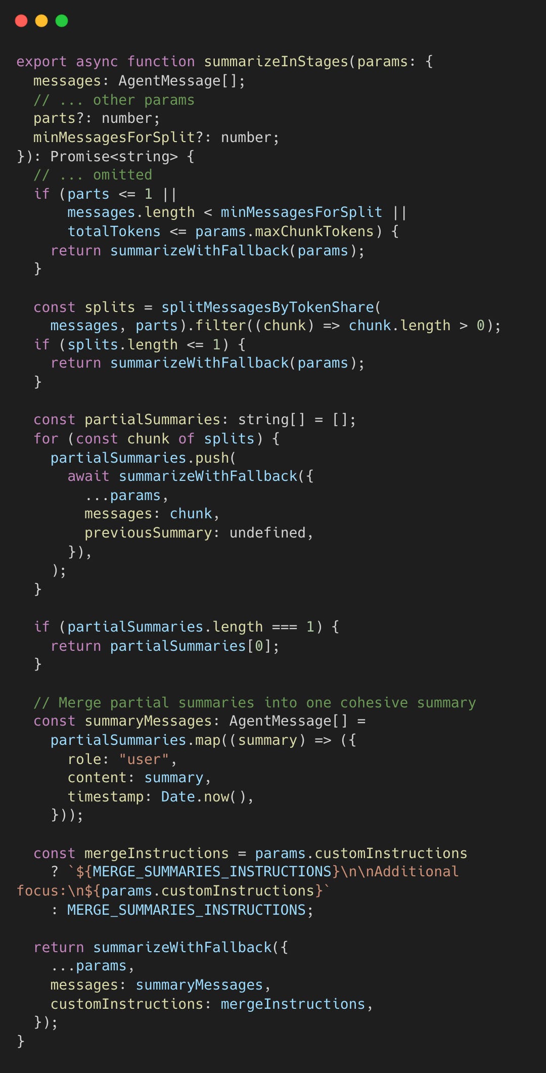 Summarizing large conversations in one shot can overflow the context window.