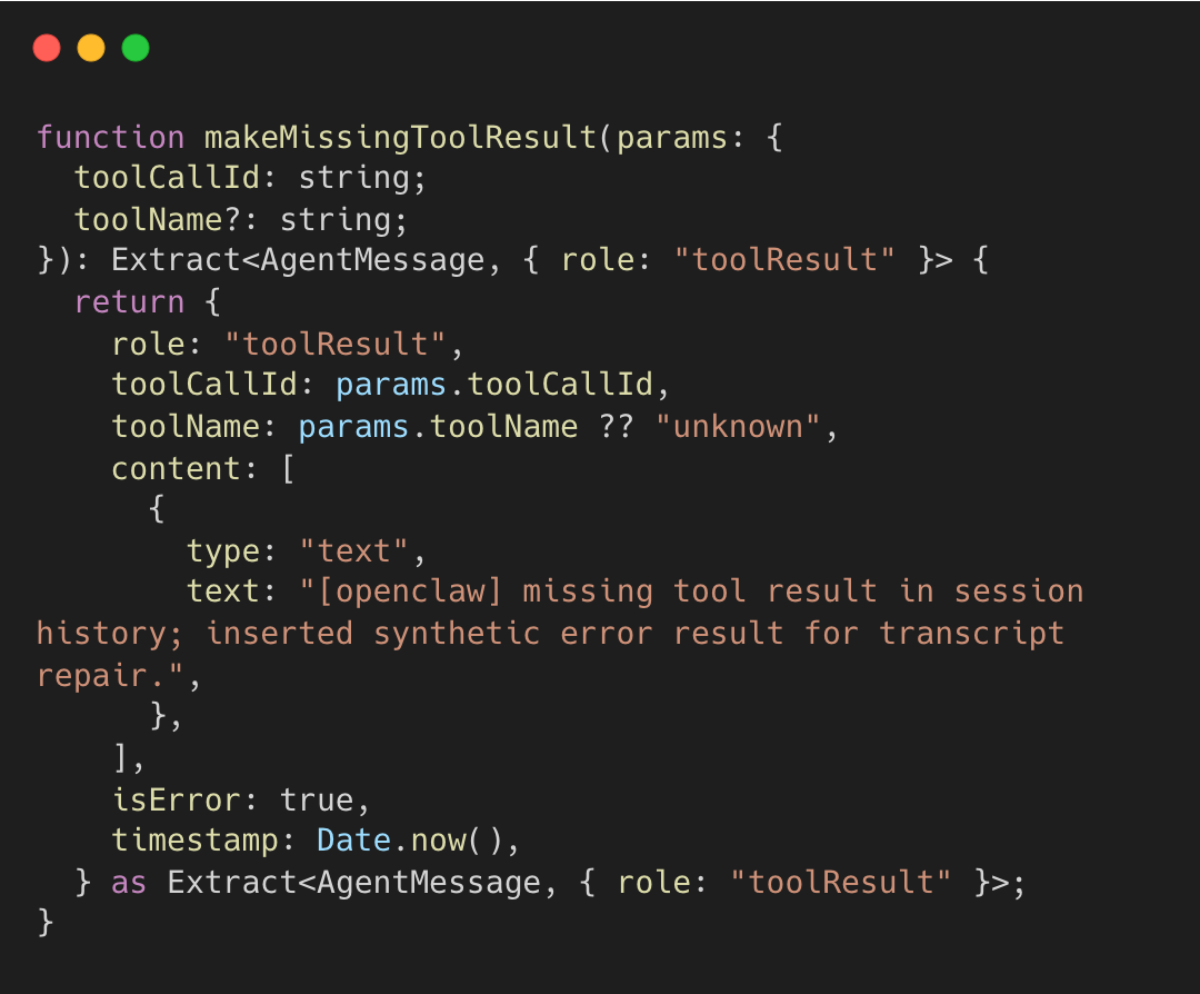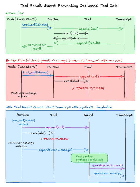 LLM APIs expect every tool_call to have a matching tool_result. If a tool times out or crashes mid-execution, the session is left with an orphaned tool call, and the next API request fails or causes the model to hallucinate a result.