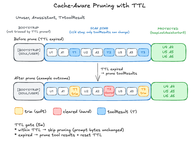 To preserve the immediate conversational flow, the last 3 assistant turns are always protected from pruning. The soft trim phase leverages Technique 6 to reduce message size while keeping critical beginnings and endings.