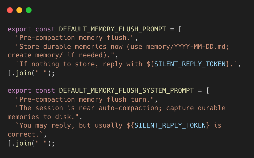 When the flush runs, the prompts explicitly tell the agent where to write and how to stay silent if nothing is worth saving.