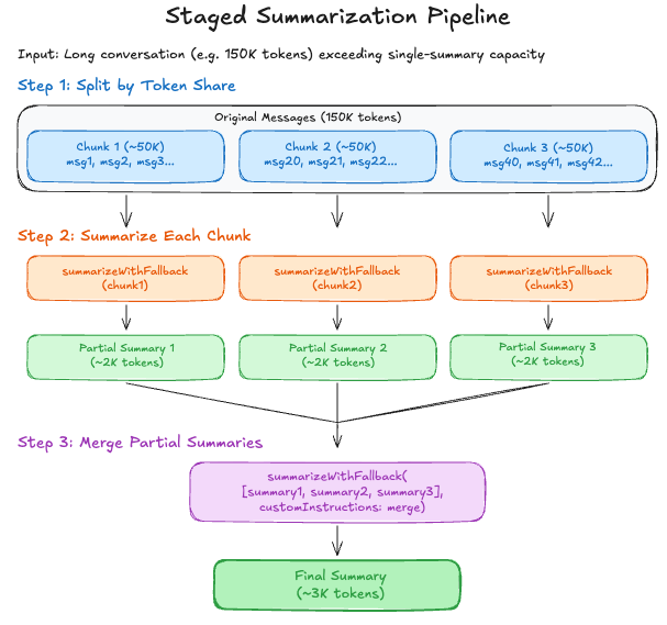 The compaction safeguard invokes staged summarization at three points: first for dropped messages (pruned due to size), then for the main history, and finally for any split turn prefixes. Each call may further subdivide if the input exceeds chunk limits.