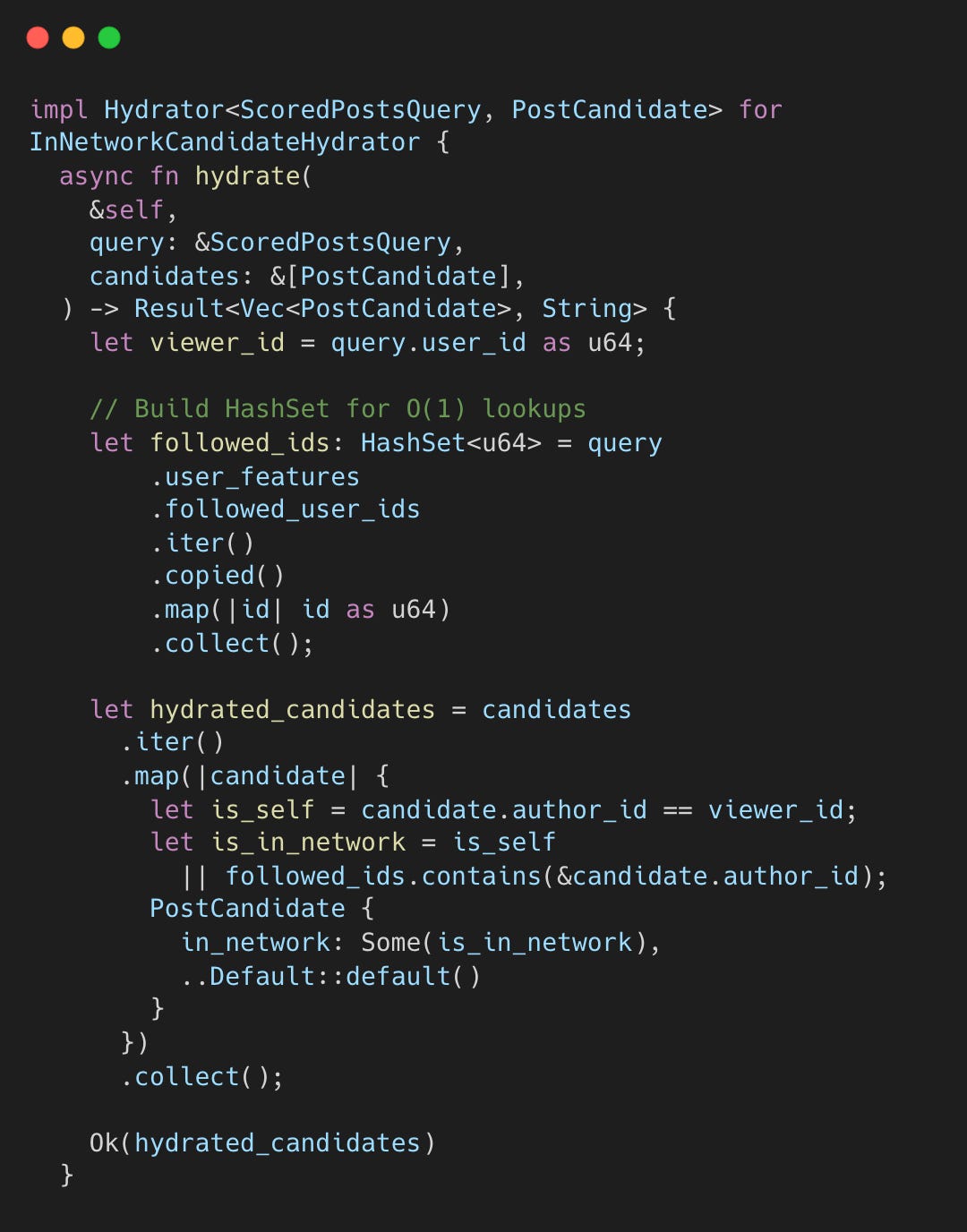 Why use a classifier? Phoenix (discovery) can sometimes return posts from followed accounts. The hydrator ensures that any post from a followed account gets in-network status, regardless of whether it came from Thunder (subscription) or Phoenix (discovery).