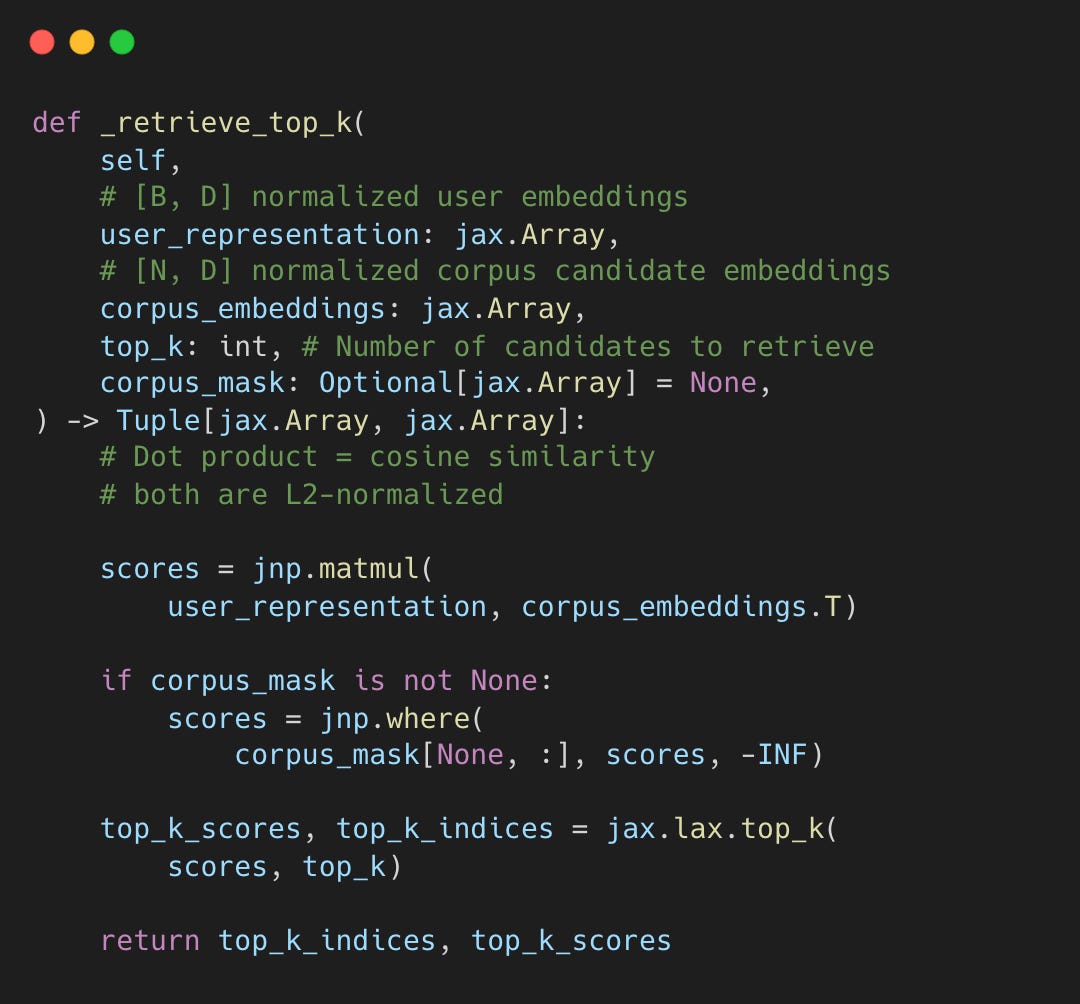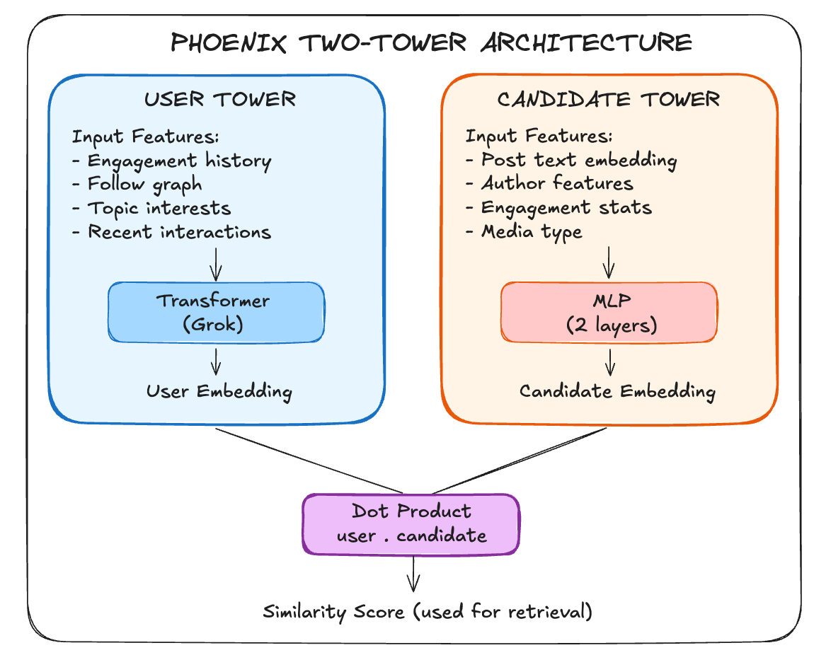 At request time, Phoenix generates a single user embedding to query millions of precomputed candidates. Top-k selection uses dot product similarity, likely optimized via Approximate Nearest Neighbor (ANN) to avoid the latency of a brute-force search.