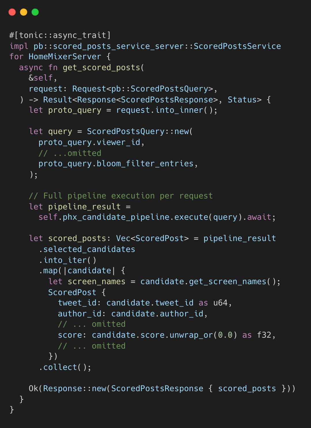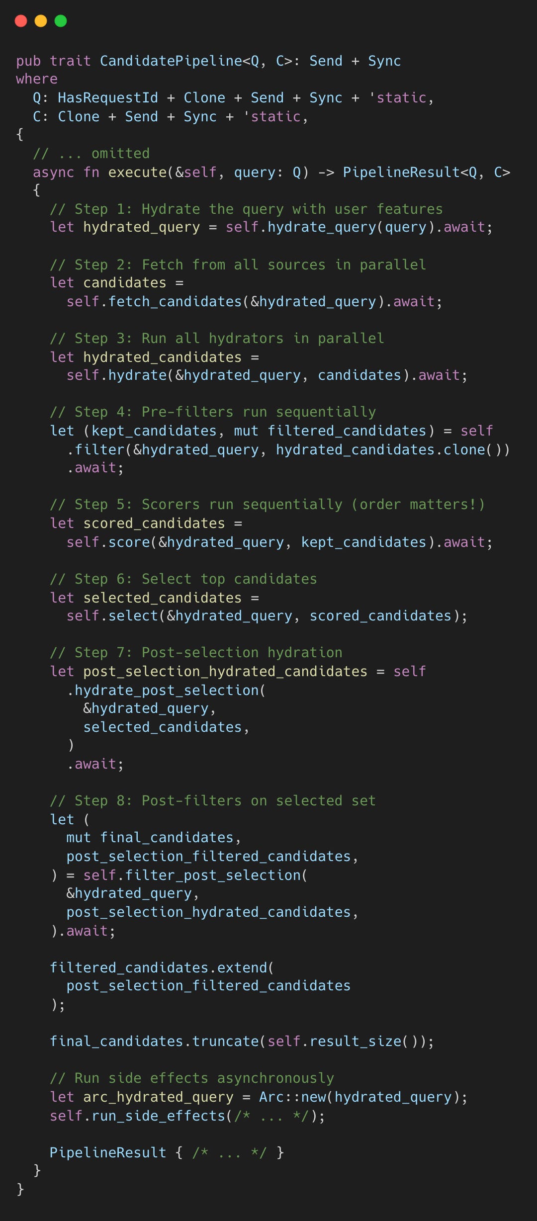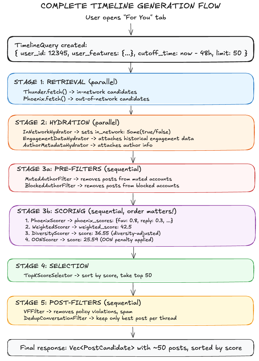 Every timeline request triggers the full pipeline. When you open “For You,” the server executes the entire pipeline.