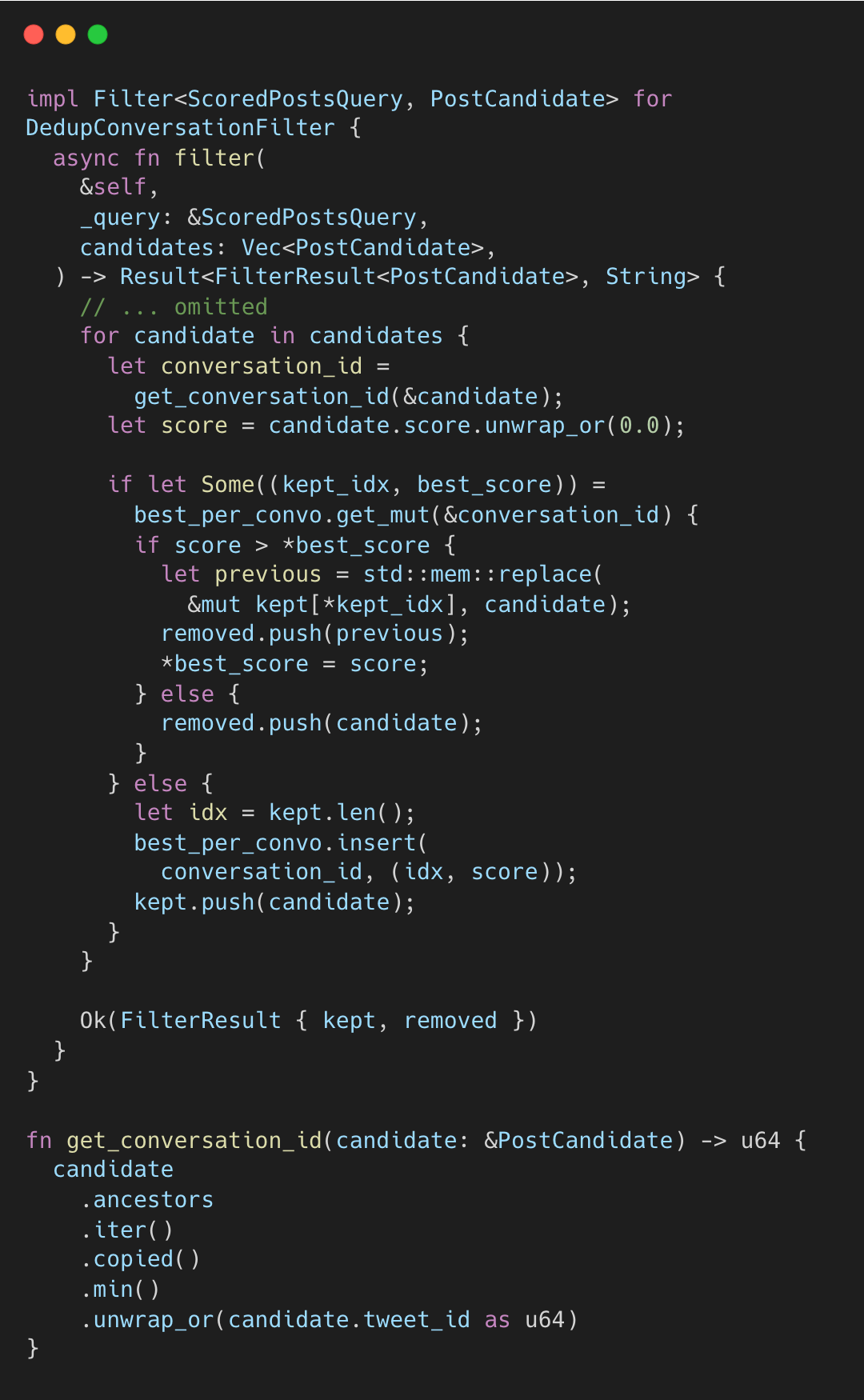 The conversation ID is the minimum ancestor ID, the root of the thread. If multiple posts from the same thread reach the top set, only the highest-scored survives. Standalone posts (no ancestors) use their own tweet_id, so they always pass.