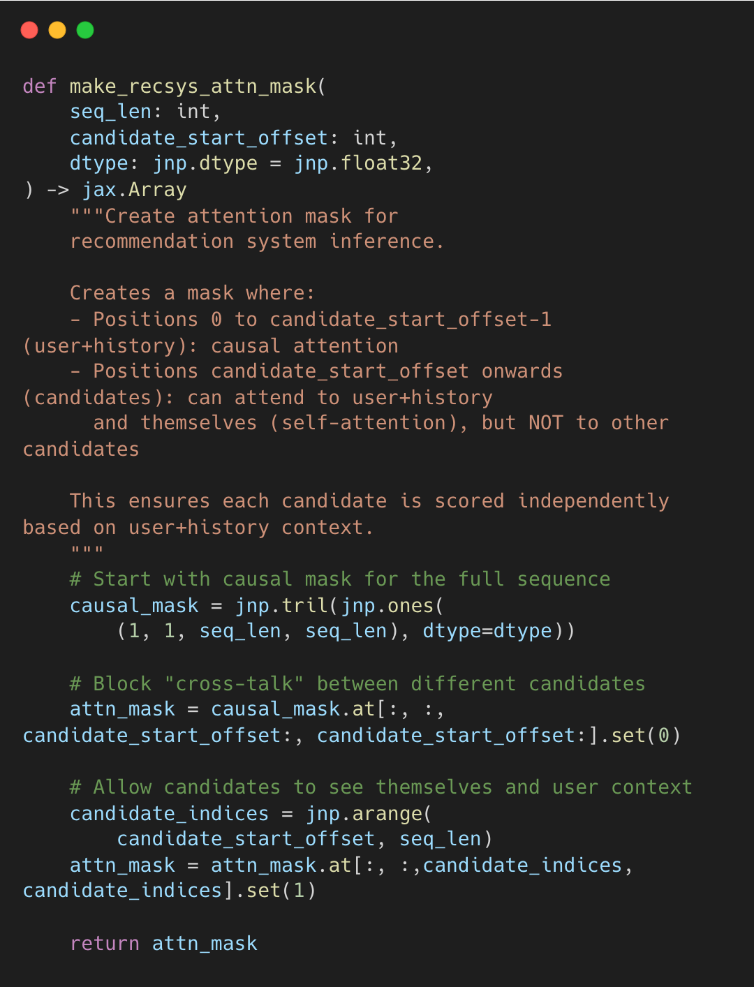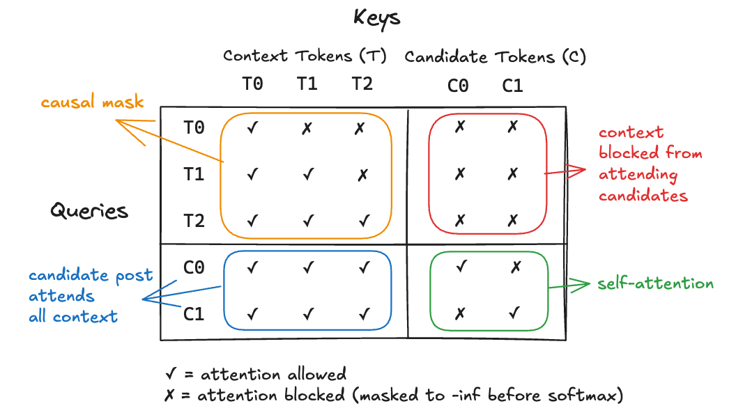 Standard attention would allow candidates in the same batch to influence each other’s scores. To ensure a post’s score depends only on the user context, X uses make_recsys_attn_mask to isolate candidates.