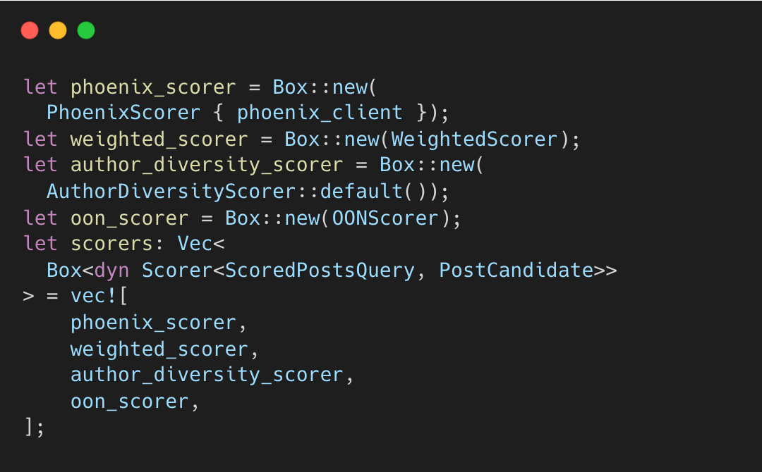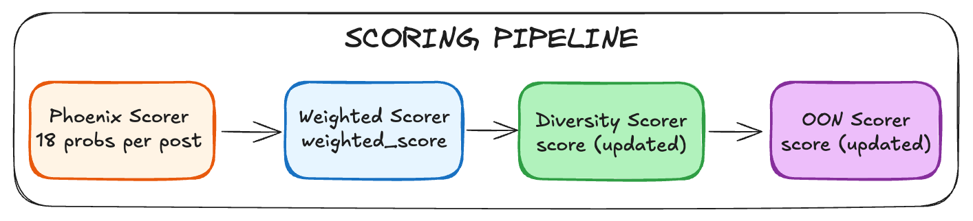 This is where posts compete. Scoring happens in four sequential steps, defined in the pipeline configuration: