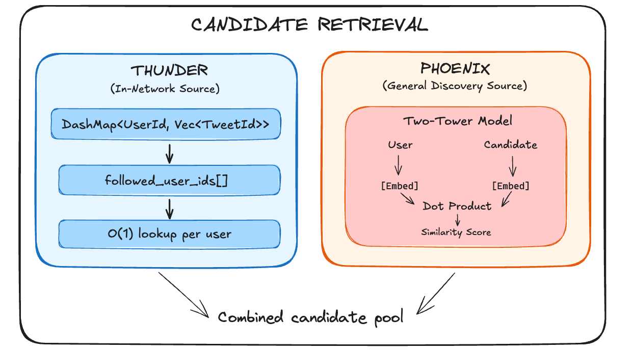 Sources fetch candidate posts. Thunder retrieves posts from accounts you follow (in-network). Phoenix serves as a general discovery engine, using ML similarity matching to find relevant posts across the entire platform (both out-of-network and in-network).