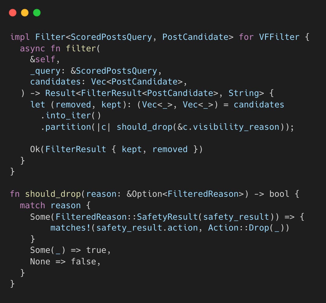 Any FilteredReason or Action::Drop triggers removal, leaving only posts with no visibility issues. The specific safety labels, like spam or policy violations, are determined by the external xai_visibility_filtering service.