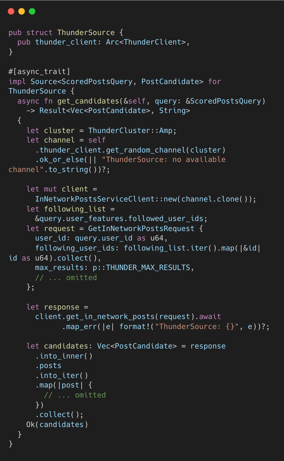Thunder and Phoenix return a pool of candidate posts, each as a PostCandidate struct. Classification happens next.