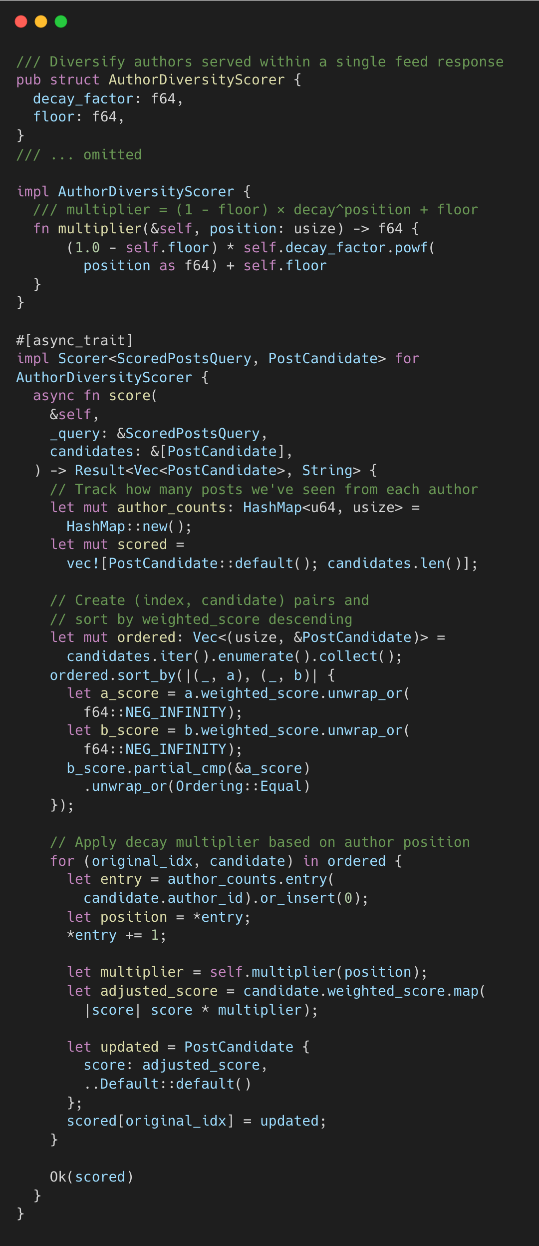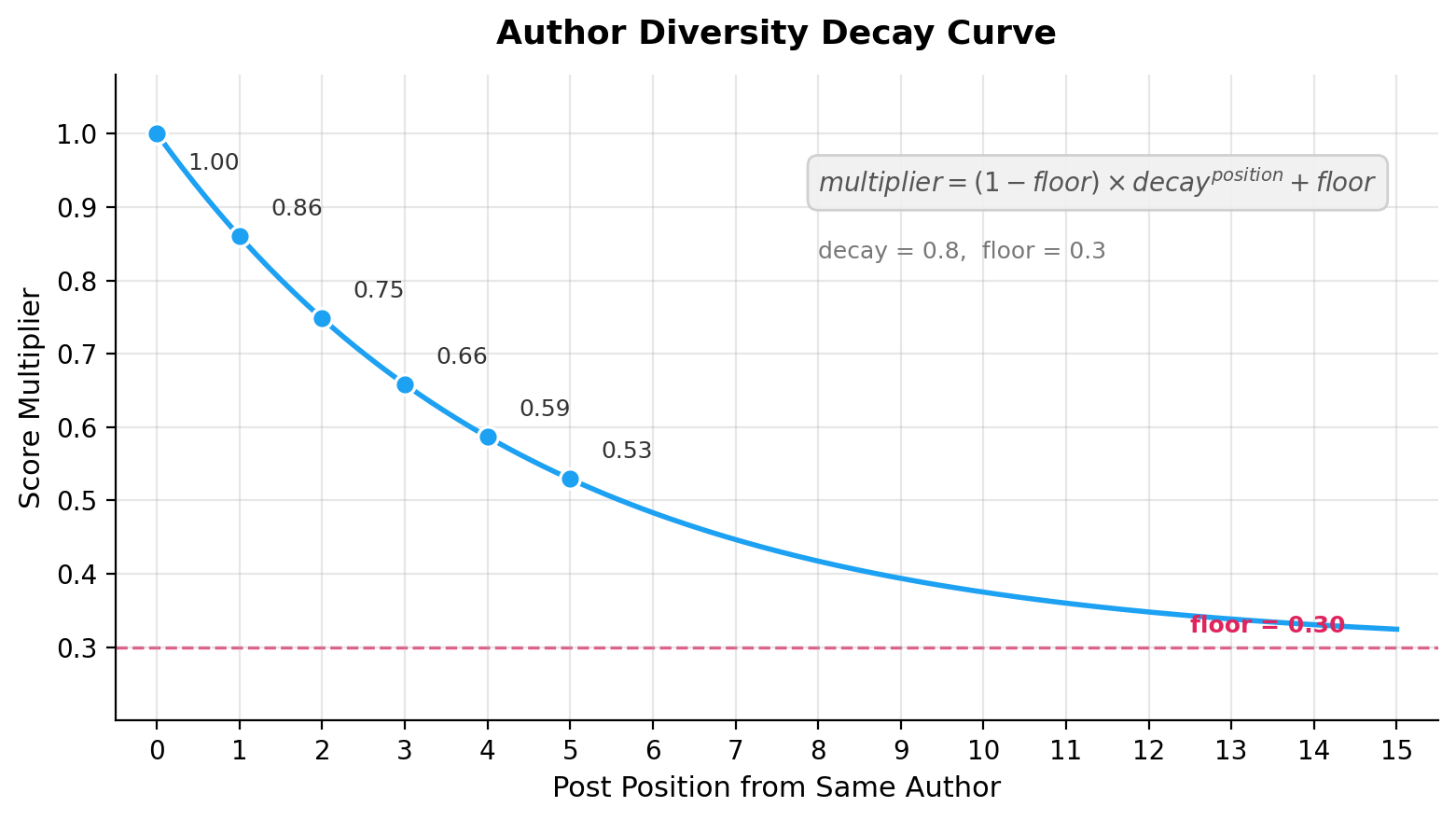 The floor parameter (e.g., 0.3) ensures even a prolific author’s later posts retain some score, balancing diversity with relevance.