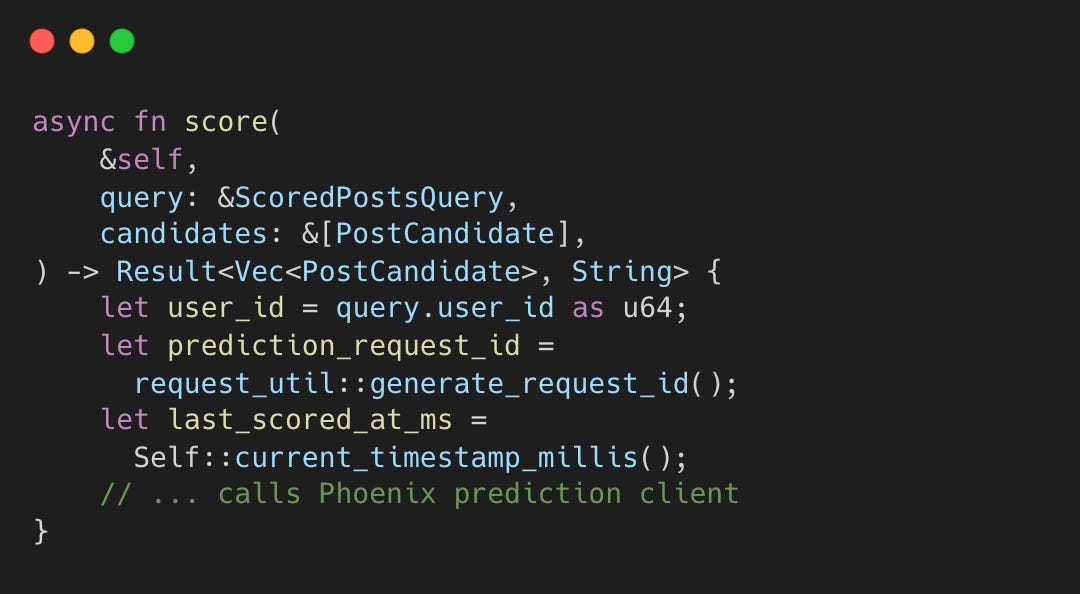 The Phoenix Scorer uses a Grok-based transformer to predict engagement. It generates a unique request ID and timestamp for each call: