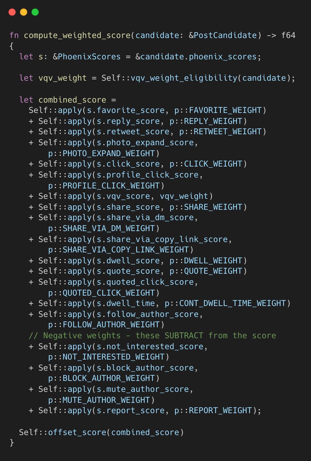 Quote-tweets count as positive. Angry quote-tweets trigger quote_score, which has a positive weight. Outrage sharing is still sharing in the algorithm’s eyes. The model can’t distinguish “quoting to criticize” from “quoting to endorse.”
