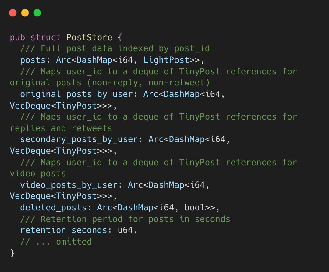 Thunder’s PostStore maintains indices for original posts, replies/retweets, and video content, enabling O(1) lookups.