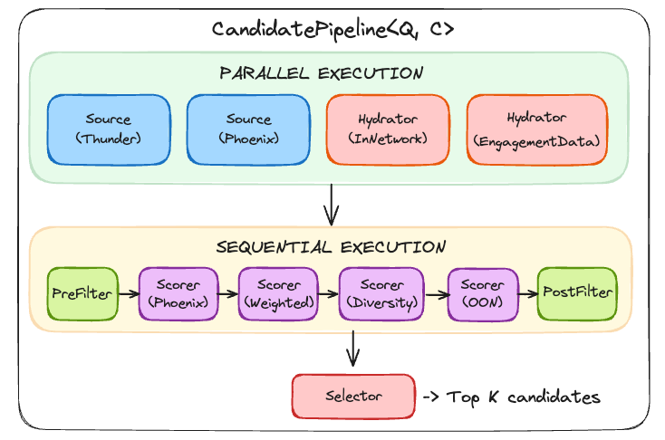 The CandidatePipeline framework is the modular foundation, defining how recommendation stages interact.