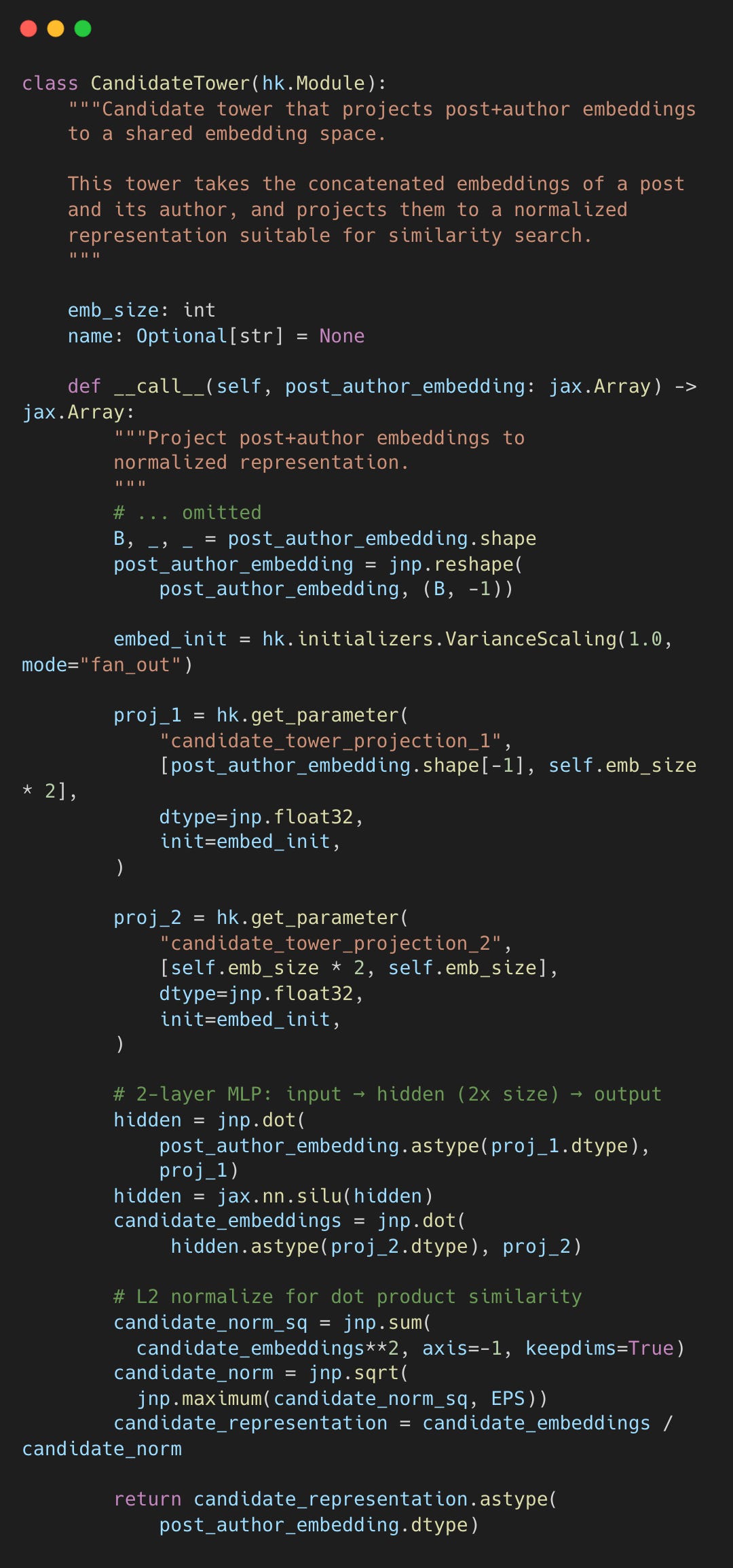 The candidate tower is simple: a 2-layer MLP with SiLU activation projecting post+author embeddings into the shared space.