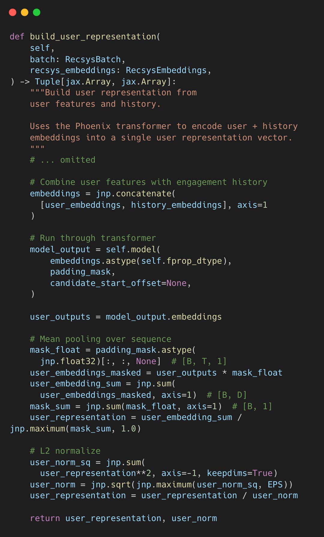 This means a post’s score can change between requests as engagement accumulates. For example, if User A sees your post at hour 1 (100 likes), and User B sees it at hour 3 (500 likes), Phoenix receives different engagement features and may produce different predictions.